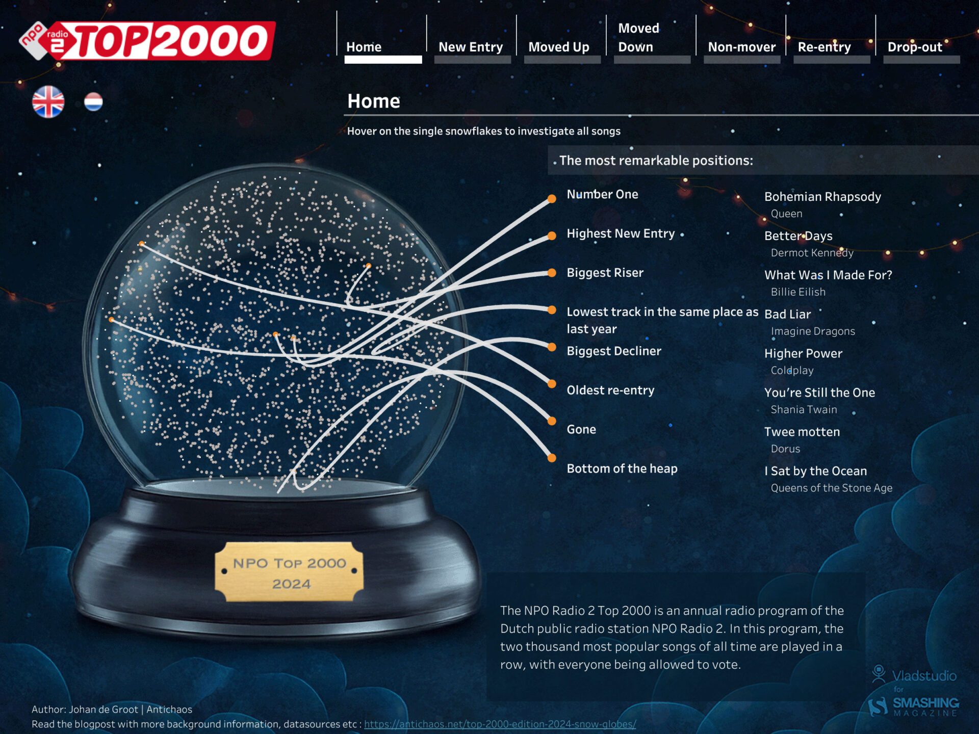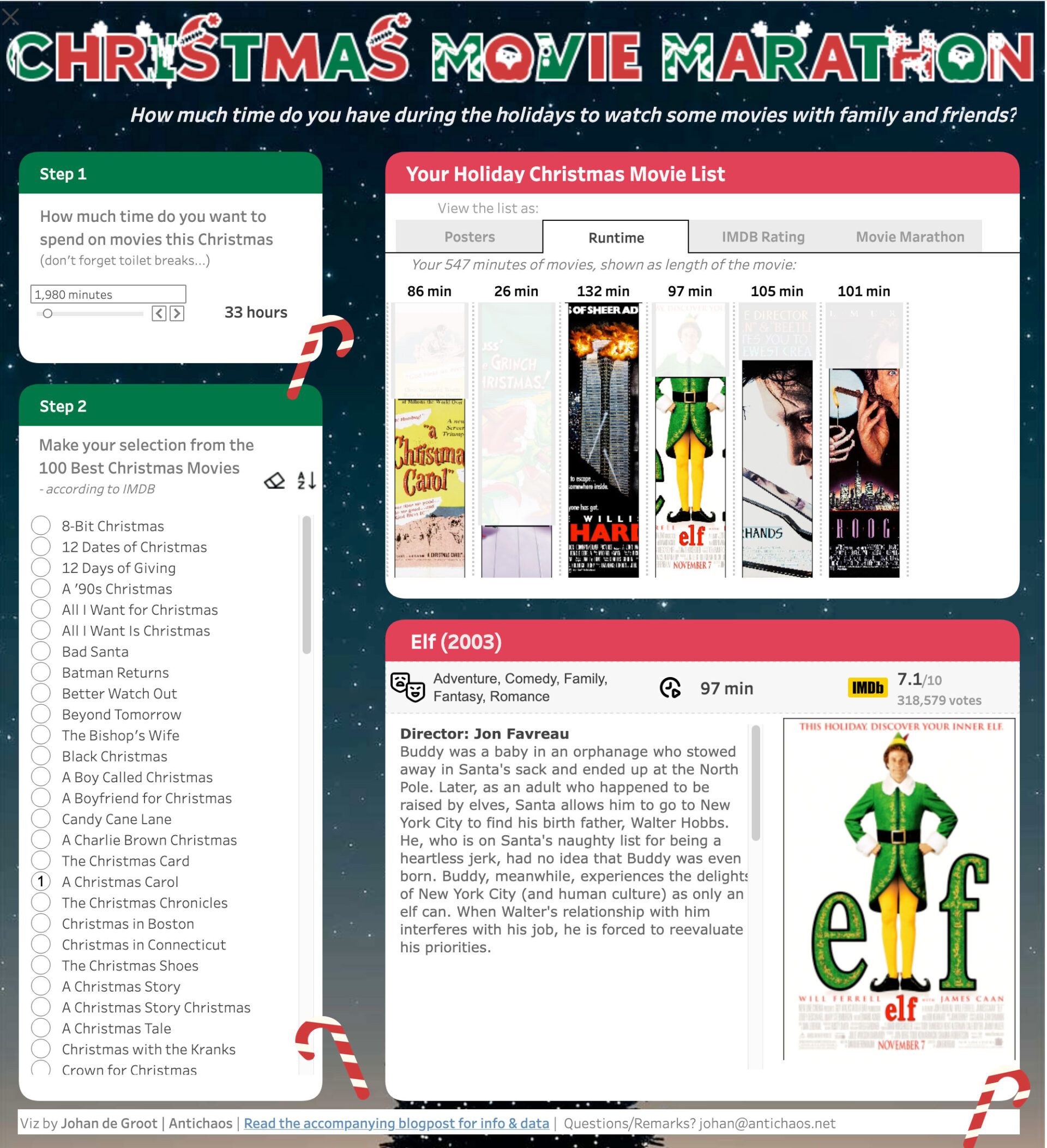 Portfolio Een aantal voorbeelden van dashboards die ik gemaakt heb: Top 2000 | Radio 2 NL | 2024 Let there be Drama! Look who’s talking Weather Forecast The Big Mac Index Christmas Movie Marathon Laad meer Laad meer… Het einde van de lijst Neem even contact op voor een uitgebreider portfolio, of vragen!